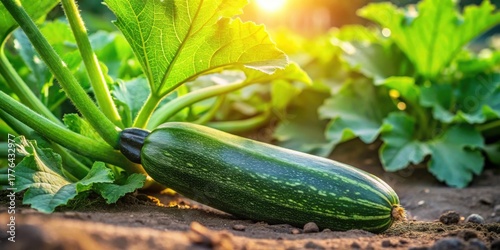 A vibrant green zucchini rests gently on fertile soil, bathed in the warm glow of the setting sun, its leaves showcasing the lushness of a thriving garden
