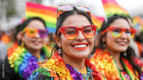 A vibrant group of women celebrating at a parade, adorned in rainbow colors and floral leis, showcasing joy and pride, LGBTQ+ , Pride month.