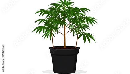 A vibrant illustration of a cannabis plant in a dark pot against a plain white background.