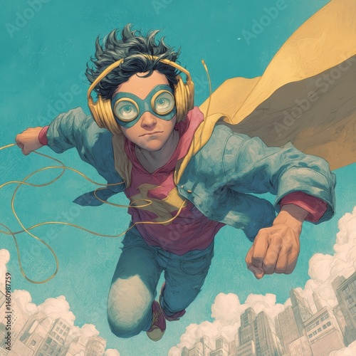 flying, youth, hero, illustration, vibrant, colourful, superhero, cape, earphones, city, sky, urban, digital, art, design, character, action, fantasy, imagination, boy, teenage, figure, powerful, strong, stylish, modern, artistic, style, drawing, graphic, image, dynamic, creative, super, colours, fashion, youthful, cool, heroic, optimistic