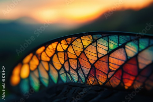 A vibrant insect wing, resembling stained glass, is illuminated by a sunset backdrop.