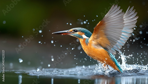 A vibrant kingfisher taking flight above the water, showcasing its stunning plumage and dynamic movement as it splashes through the surface.