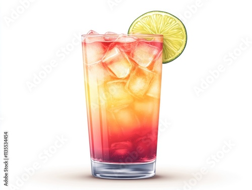 A vibrant layered drink with ice and a lime slice, perfect for refreshment.