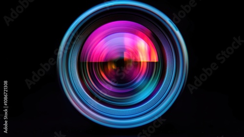 A vibrant lens reflecting colorful light against a dark background, showcasing the intricate design and depth of a camera lens.