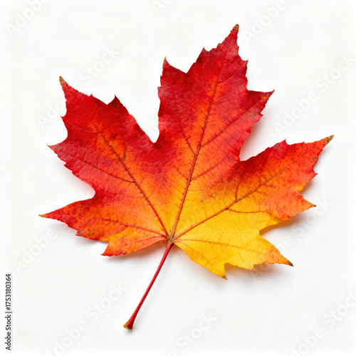 A vibrant maple leaf presents a blend of red and yellow colors, representing the beauty of autumn. The leaf rests on a clear white background, highlighting its intricate details