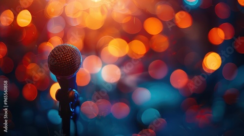 A vibrant microphone stands against a backdrop of colorful bokeh lights, perfect for music events and creative projects.