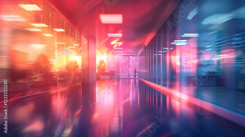 A vibrant, modern office corridor illuminated by colorful lights and reflections.