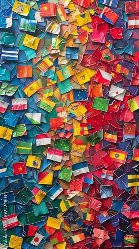 A vibrant mosaic wall features flags from diverse countries in triangles and squares. Gradient colors symbolize unity and diversity.