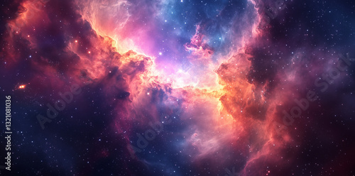 A vibrant nebula ignites the cosmos with swirling hues of pink, purple, and gold. Ethereal clouds of gas and dust form a celestial masterpiece, illuminated by distant stars in deep space.