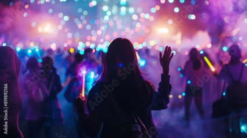 A vibrant night scene at a music festival, with attendees wearing glow sticks and dancing to the beat.