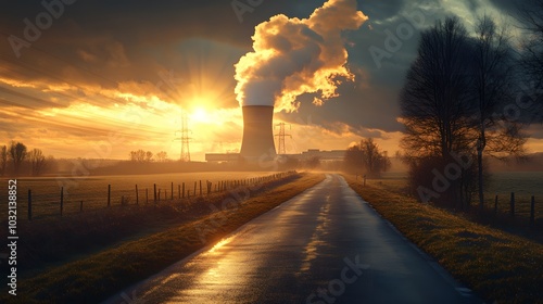 nuclear, power, plant, cooling, tower, vibrant, blue, sky, fluffy, cloud, gold, sunlight, green, meadow, paved, road, silhouette, tree, steam, emission, industrial, landscape, environmental, contrast, dramatic, lighting, fisheye, view, high, dynamic, range, scenery, technology, energy, production, efficiency, engineering, optical, infrastructure, element, complexity, nature, photo, exploration
