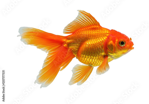 A vibrant orange goldfish with long, flowing fins, isolated on a white background