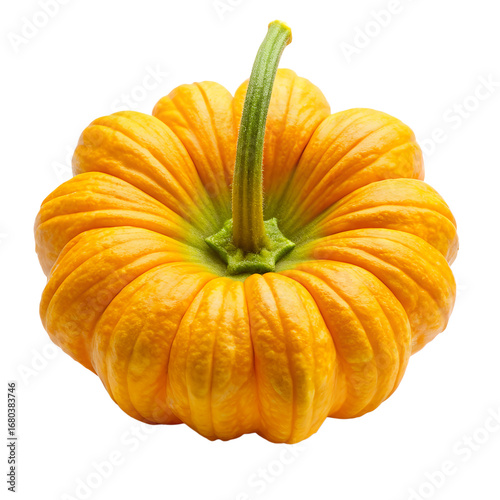 A vibrant orange pumpkin with a green stem, isolated on a transparent background, showcasing its ribbed texture and unique shape