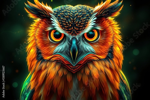 owl, bird, vibrant, black, background, orange, green, electric, colours, beak, eye