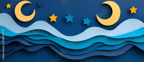 A vibrant paper cut-out design featuring waves, stars, and moons on a deep blue background, perfect for creative projects and assorted illustrations.