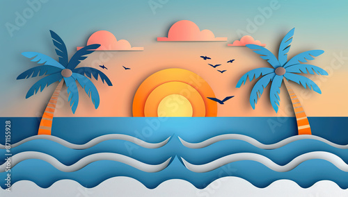 A vibrant paper-cut style illustration of a tropical beach sunset scene with palm trees.