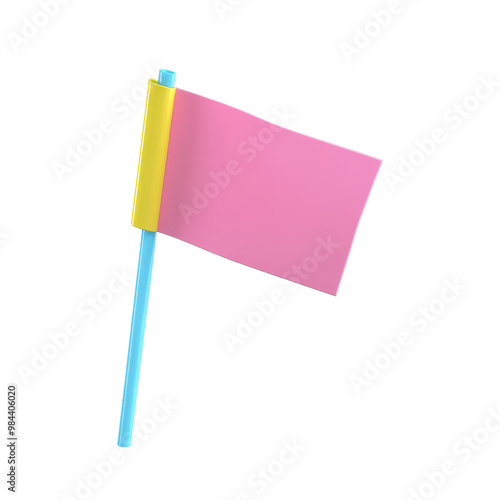 A vibrant pink flag mounted on a blue stick, symbolizing celebration and creativity in a minimalist design., isolated on a transparent background.
