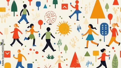 people, nature, walking, tree, balloon, pattern, graphic, interaction, shape, diversity, engagement, playful, exploration, youth, relationship, animation, community, vibrant, festival, creativity, joy, colours, connection, scenery, life events, motion, happiness, energy, fun, art, urban, sun, lifestyle, leisure, childhood, cheerful, design, fashion, activity, adventure, environment, summer, landscape