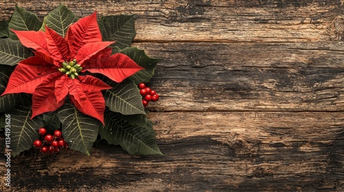 A vibrant poinsettia plant with red leaves and green foliage placed on a rustic wooden surface, evoking a festive holiday atmosphere.