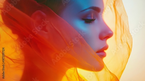 woman, profile, portrait, vibrant, colours, light, semitransparent, fabric, draped, face, eye, lip, head, hair, colours, style, art, fashion, beauty, portraiture, lighting, photo, model, design, texture, soft, glowing, smooth, subtile, detail, close, up, aesthetic, beautiful