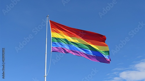 A vibrant rainbow flag waves proudly in the wind against a clear blue sky, symbolizing LGBT pride and solidarity. The bright colors of the flag stand out vividly, capturing the essence of inclusivity