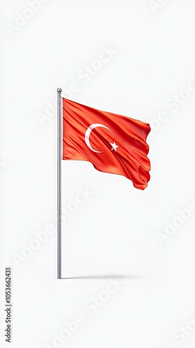 A vibrant red flag of Turkey, adorned with a white crescent moon and star, stands proudly on a pole against a crisp white backdrop