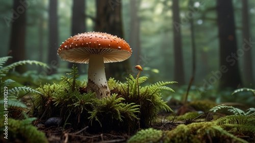 A vibrant red mushroom with white spots stands tall amidst lush green moss and ferns in a misty forest. A smaller mushroom is visible nearby.