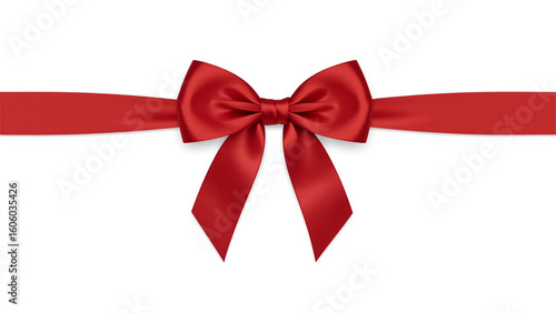 A vibrant red satin bow, perfectly tied, adorns a matching ribbon against a clean white background, creating a festive and elegant presentation.