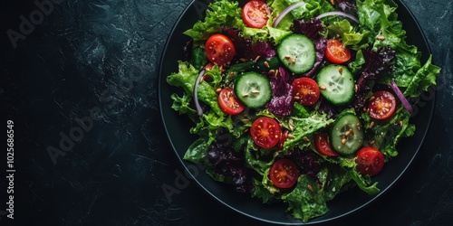 A vibrant salad featuring mixed greens, tomatoes, cucumbers, and onions in a dark bowl.