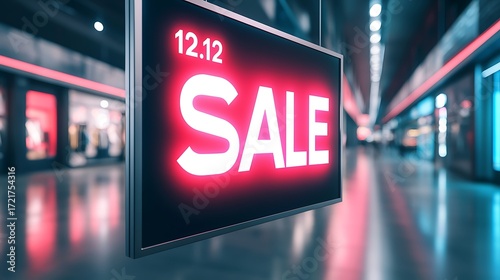 A vibrant sale sign lights up a shopping corridor, advertising a special offer for December 12th, creating an inviting retail atmosphere.