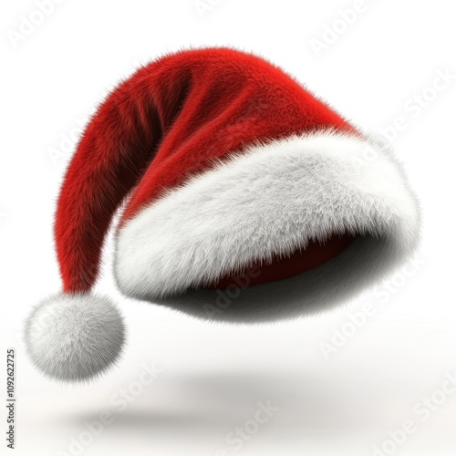 A vibrant Santa hat, emblazoned in red, showcases a plush white trim and pom-pom, hovering effortlessly against a smooth monochrome background, evoking holiday cheer and warmth