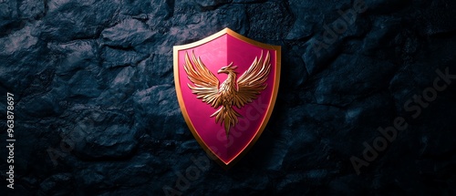 A vibrant shield featuring a golden phoenix on a pink background, symbolizing resilience, strength, and rebirth.
