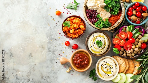 A vibrant spread of healthy Mediterranean food with vegetables, hummus, and breads, displayed on a marble background.