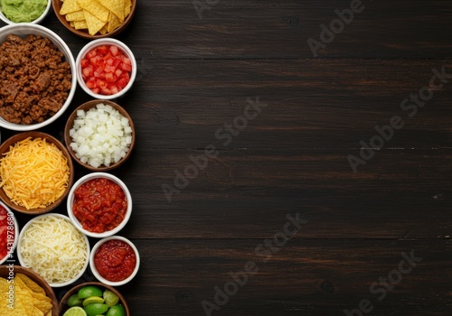 taco, ingredient, food, mexican, cookery, nacho, salsa, cheese, meat, onion, tomatoes, diced, guacamole, table, overhead, topview, background, texture, rustic, fresh, homemade, party, gathering, appetiser, dinner, lunch, celebration, festive, spicey, seasoning, mexican food, favor, colourful, eatery, take-out, family, friends, diet, healthy, delicious, vegetarian, party food, cooking