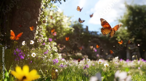 A Vibrant Spring Garden Filled With Colorful Butterflies Dancing Among Blooming Flowers Under a Bright Blue Sky During a Sunny Afternoon