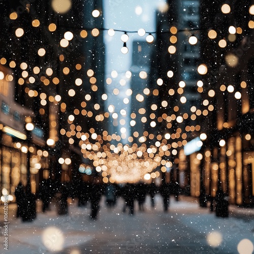 A vibrant street scene adorned with twinkling lights, perfect for capturing the essence of winter festivities.