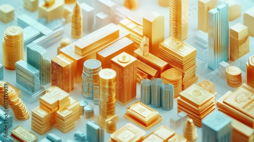 A vibrant, stylized cityscape featuring golden buildings and structures, creating an abstract urban environment with a futuristic feel.