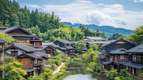 A vibrant summer scene in Ouchi-juku, with lush greenery surrounding the traditional houses and a clear blue sky overhead.