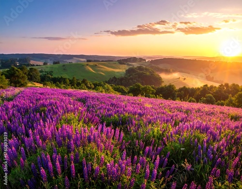 sunset, field, purple, flower, blooming, landscape, gold, light, hill, sky, cloud, nature, dawn, horizon, beauty, calm, serene, majestic, scenic, vibrant