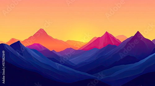 A vibrant sunset illuminates a majestic mountain range in the vector illustration.