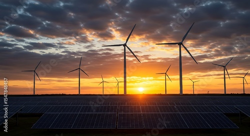 A vibrant sunset illuminates a sprawling landscape of solar panels and towering wind turbines, symbolizing the powerful embrace of renewable energy and a sustainable future.