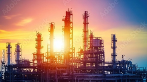 A vibrant sunset over a factory with silhouetted smokestacks and structures, creating a dramatic and powerful image of industrial activity against nature