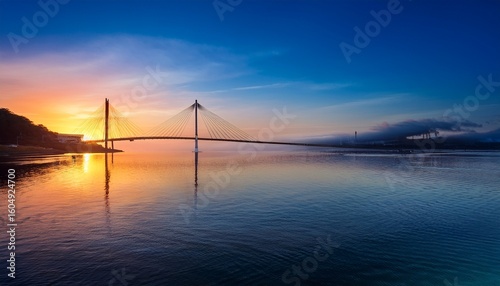 a vibrant suspension bridge at sunrise over calm water