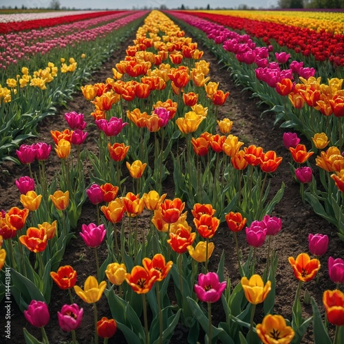 A vibrant tulip garden with rainbow-colored flowers stretching to the horizon.