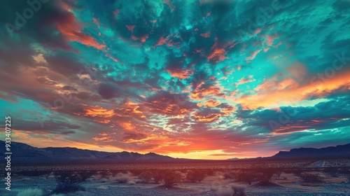 A vibrant turquoise sky over a desert landscape at sunset, casting a magical glow