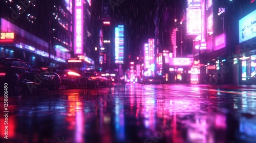 A vibrant urban scene at night, featuring neon lights reflecting on wet streets, creating a dynamic atmosphere full of life and energy.