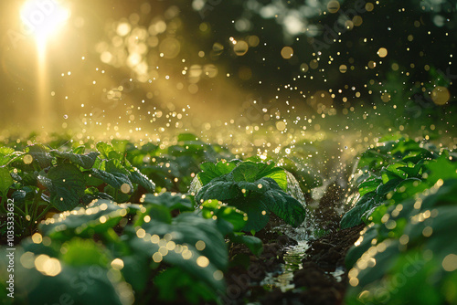 kitchen garden, watering, irrigation, plant, droplet, mist, nature, lush, growth, agriculture, garden, freshness, leaf, dirtied, sunlight, cultivation, farming, greenery, water, crop, landscape, rural, scene, environment, season, morning, calmness, vitality, moisture, productivity, gardening, nurturing, closeup, refreshment, beauty, organic, sustainable