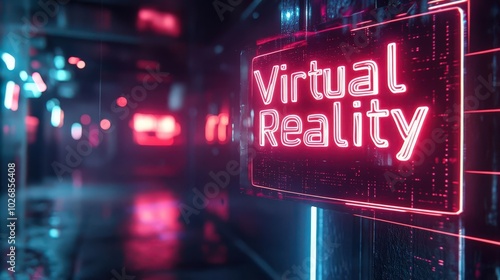 A vibrant virtual reality scene featuring neon lights and a futuristic ambiance, perfect for technology and gaming concepts.