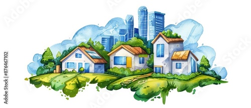 vibrant, watercolor, depiction, sustainable, architecture, highlight, environmentally friendly, build, material, green, nature, healthy, energy, design, modern, isolate, urban, hygiene, city, copy, eco, landscape, office, background, promote