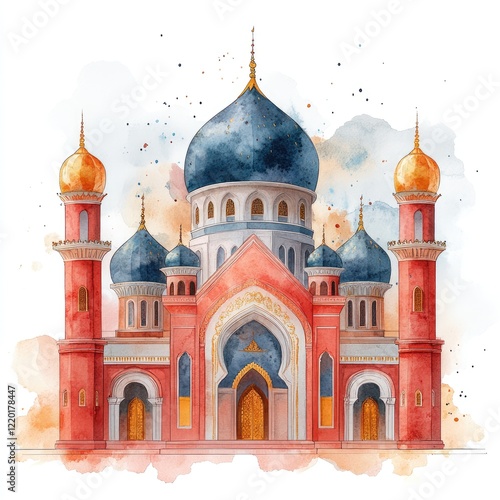 A vibrant watercolor illustration of an ornate building with domes and arches, set against a soft background